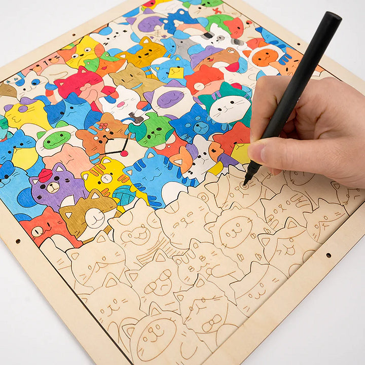 Odkryj idealne połączenie sztuki i relaksu dzięki naszym drewnianym puzzlom do kolorowania. Każdy drewniany element jest starannie wykonany i precyzyjnie wycinany laserowo, co daje przyjemne wrażenia dotykowe podczas malowania i składania. Niezależnie od tego, czy chcesz odprężyć się po długim dniu, czy szukasz uważnej, wyciszającej aktywności, te puzzle przyniosą Ci spokojną, twórczą przyjemność na wyciągnięcie ręki.