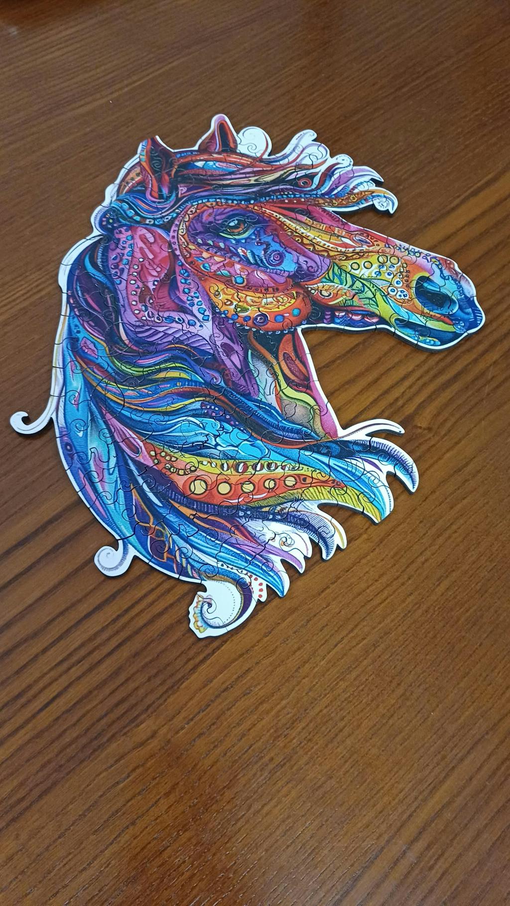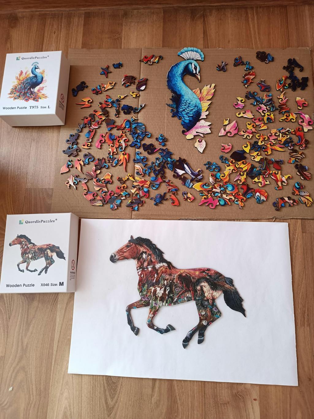 Puzzle są bardzo ładne, ale trudniej się układa rozmiar M bo są małe części, na razie udało mi się złożyć konia trzy dni składania. Gdy kupię ramki to będą się pięknie prezentować na ścianie.