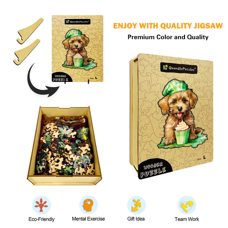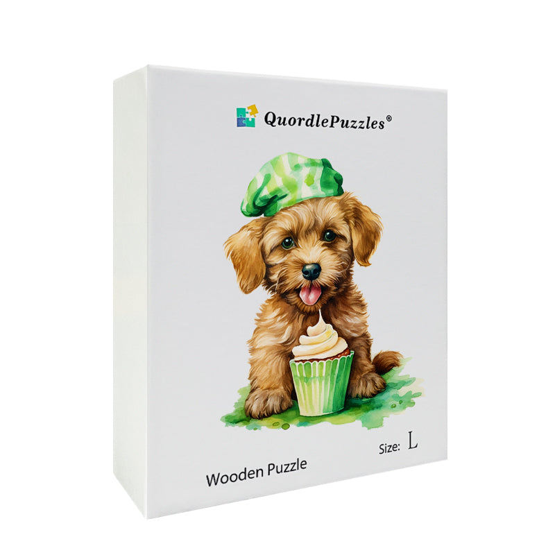 Drewniana układanka przedstawiająca szczeniaka w zielonym cylindrze
